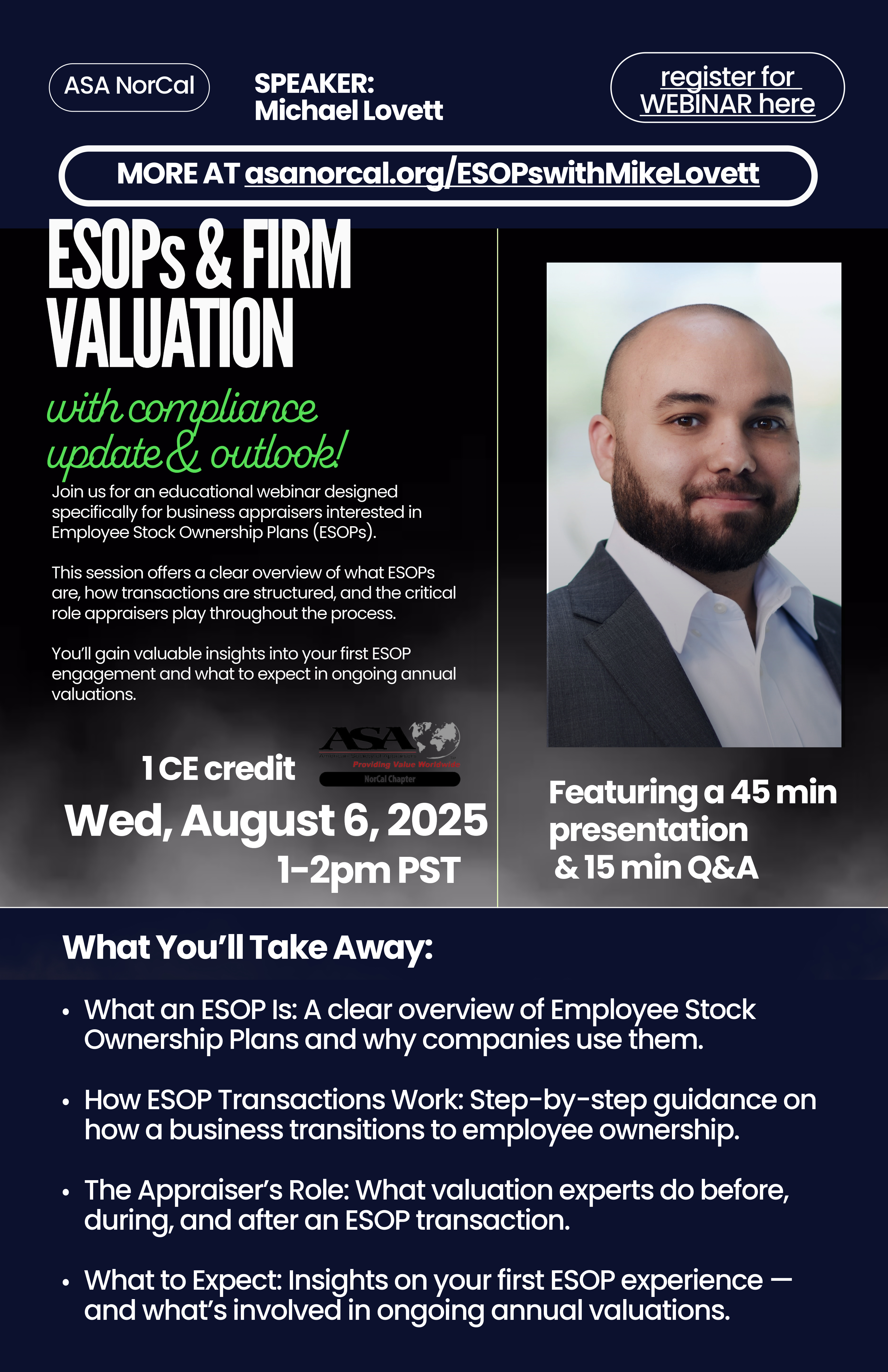 Join us for an educational webinar designed specifically for business appraisers interested in Employee Stock Ownership Plans (ESOPs). This session offers a clear overview of what ESOPs are, how transactions are structured, and the critical role appraisers play throughout the process. You’ll gain valuable insights into your first ESOP engagement and what to expect in ongoing annual valuations.